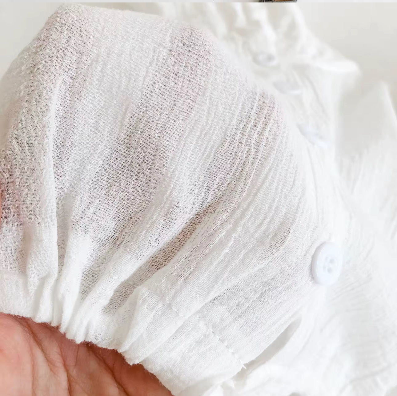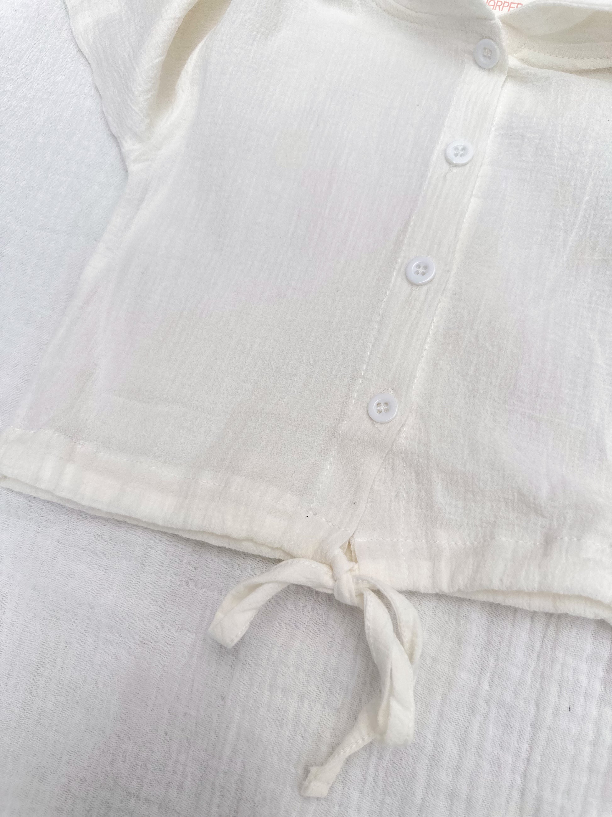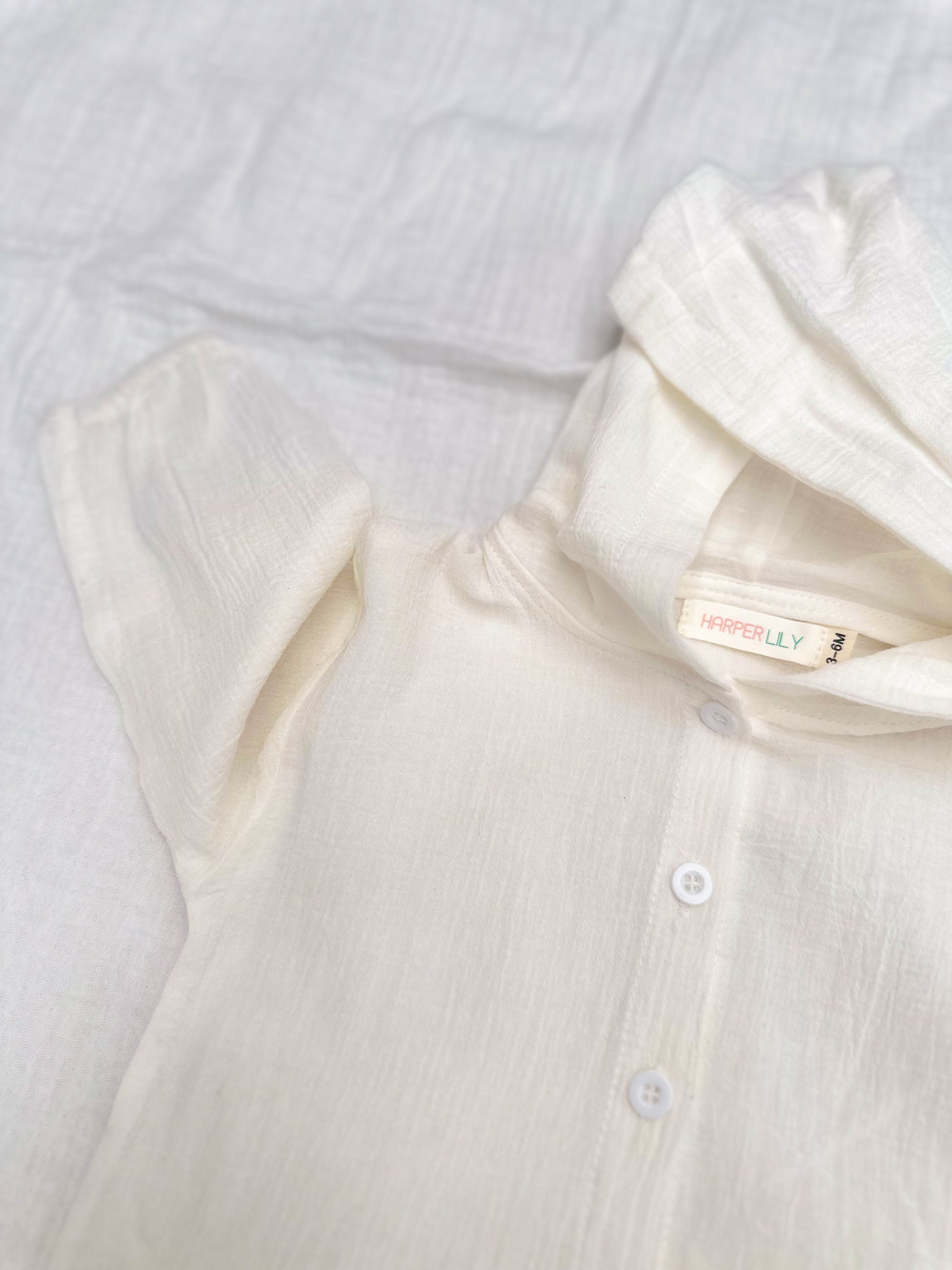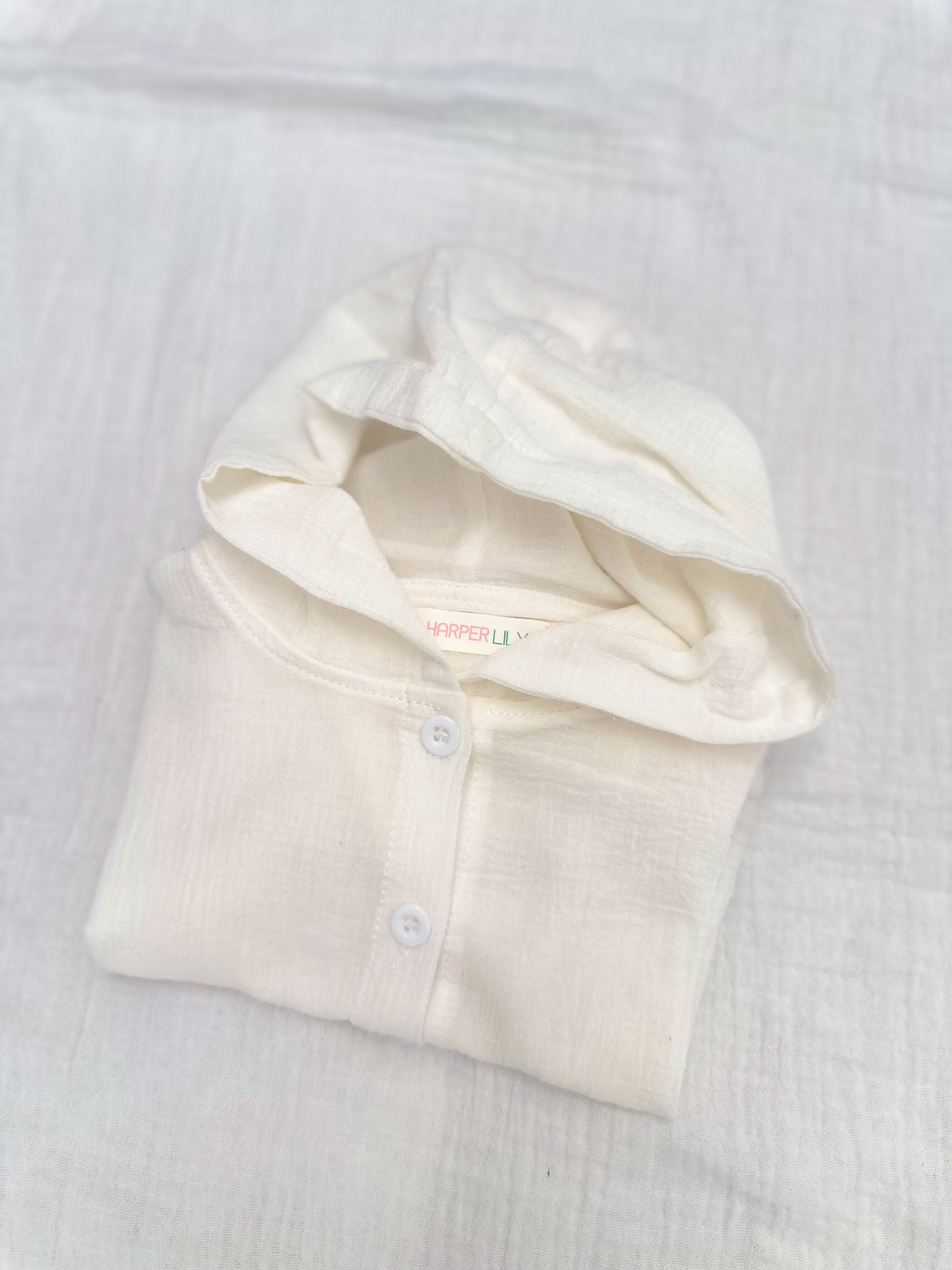 With its relaxed fit, button-up front, and soft hood, this piece layers easily over rompers, dresses, or sets. It’s not a jacket for warmth, but a gentle, floaty layer designed to keep summer days cool, carefree, and sun-safe.