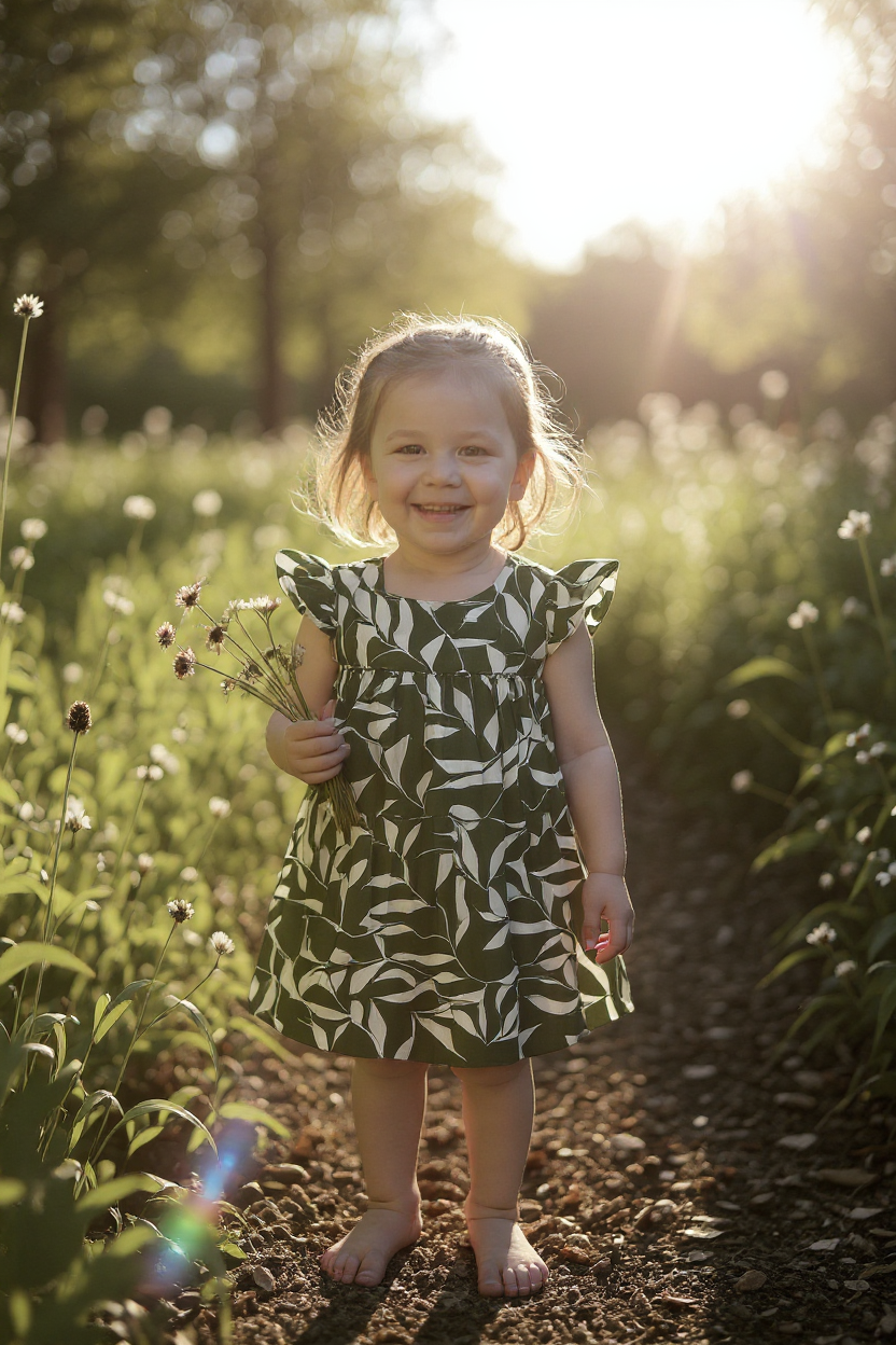 Light, playful, and ideal for those gorgeous summer days. The Meadow Float Dress features a leafy green print and flutter sleeves, it’s perfect for twirls in the garden, barefoot adventures, and golden-hour pictures.